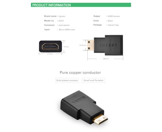 Адаптер UGREEN (20101) Mini HDMI Male to HDMI Female Adapter. Цвет: черный