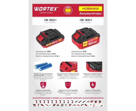 Аккумулятор WORTEX CBL 1840-1 (0329187) 18.0 В 4.0 А*ч Li-Ion ALL1