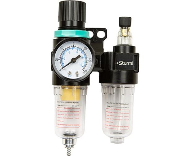 Фильтр влагоотделитель с лубрикатором для пневмоинструмента Sturm 1710-02-02 защищает инструмента от быстрого износа.