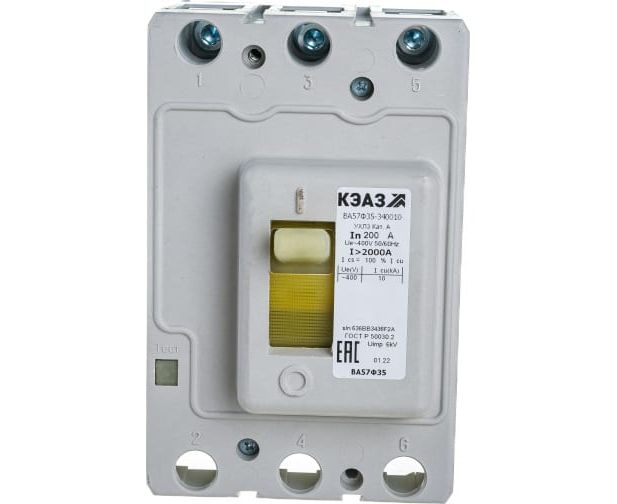 Автоматический выключатель КЭАЗ ВА57Ф35-340010-200А-2000-400AC-УХЛ3-КЭАЗ 109314 выполнен из пластика, имеет литой корпус. Имеет три полюса и блочную конструкцию. Устанавливается на панель с помощью винта.