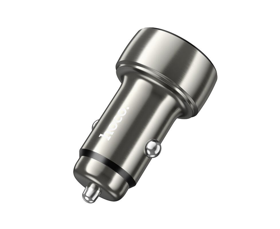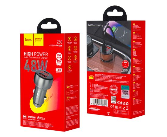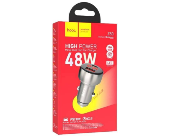 АЗУ HOCO Z50 Leader 48W dual-port PD30W+QC3.0 car charger with digital display (metal gray)