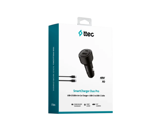 АЗУ TTEC 2CKP02CS SmartCharger Duo PD 48W Car Fast Charger USB-C+USB-A With USB-C-USB-C 3A Cable Black