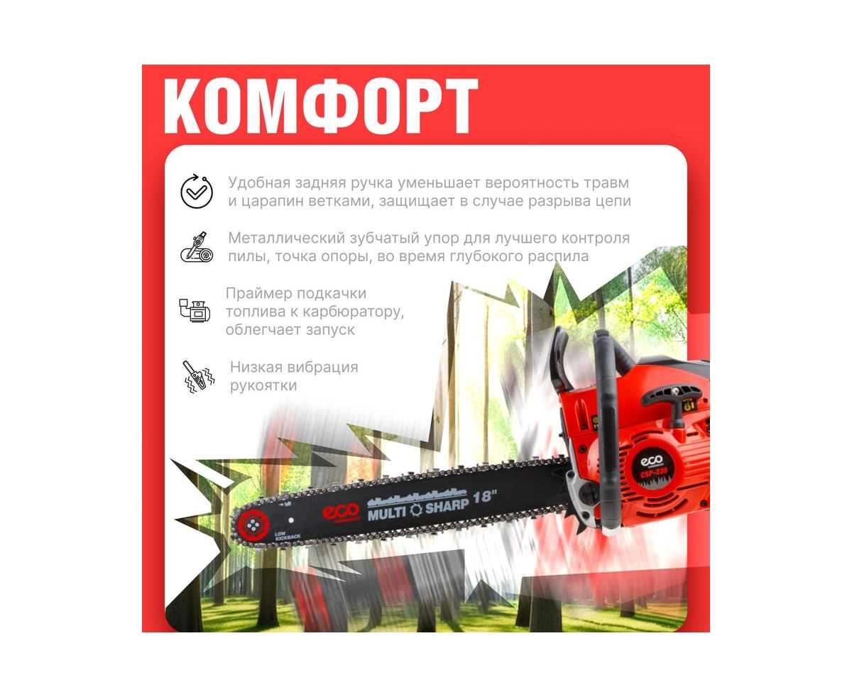 Небольшой вес, достаточная мощность и высокая скорость позволяют качественно и легко использовать бензопилу в различных условиях от заготовки дров до работы в саду. Надежный мембранный карбюратор.