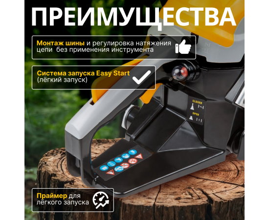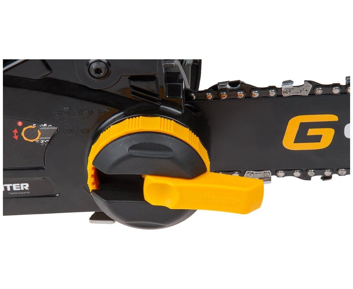 Монтаж шины и регулировка натяжения цепи осуществляется без применения инструмента, что упрощает обслуживание инструмента.