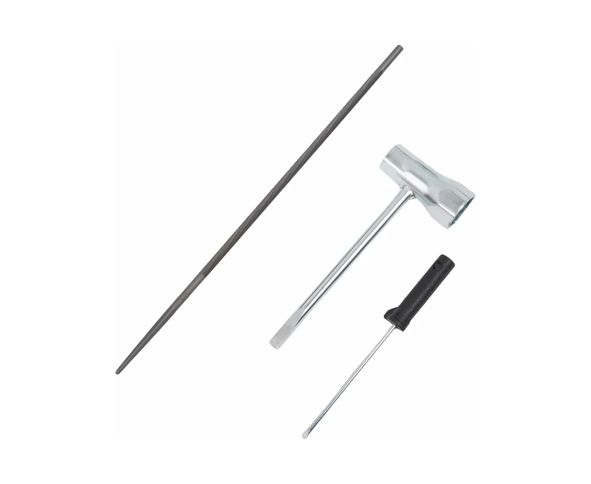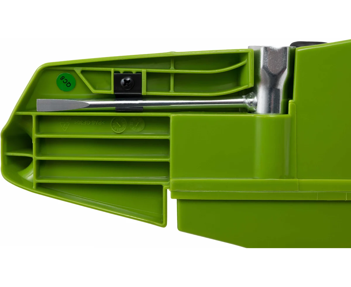 - Ключ для подтяжки цепи и замены свечи закрепляется в корпус.