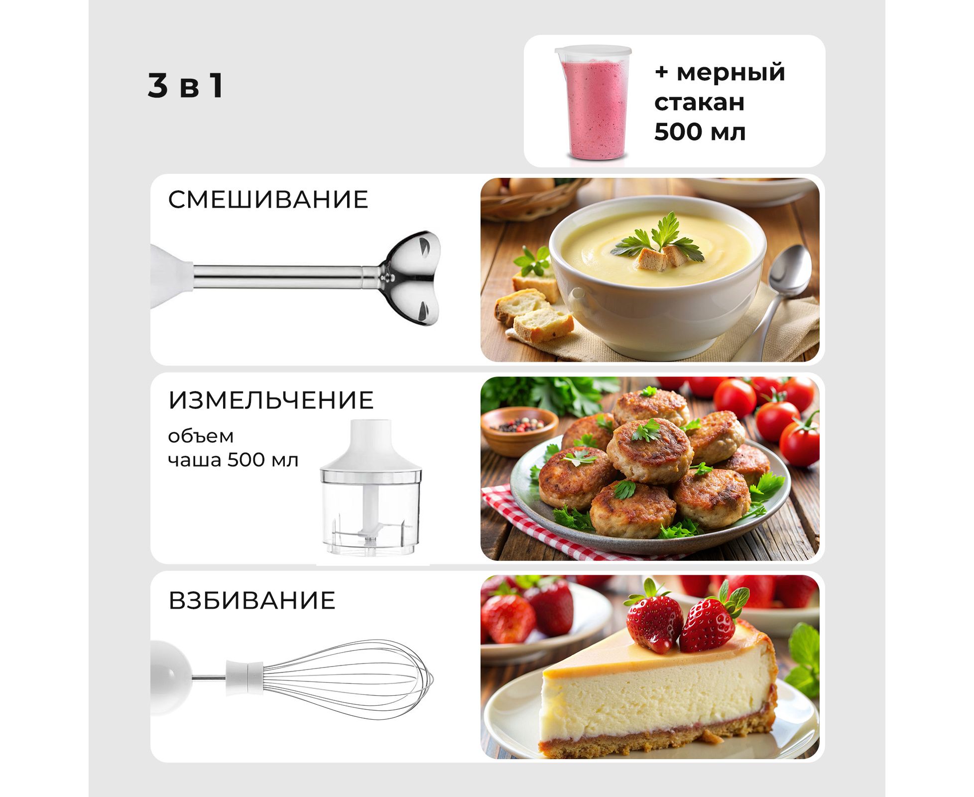 Комплектация: Сменные насадки (венчик, измельчитель)