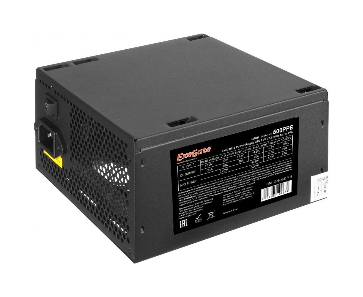 Блок питания ExeGate 500PPE (EX260641RUS-PC) 500W (ATX, APFC, PC, 80 Plus, 12cm fan, 24pin, 2x(4+4)pin, 2xPCI-E, 5xSATA, 3xIDE, black, кабель)