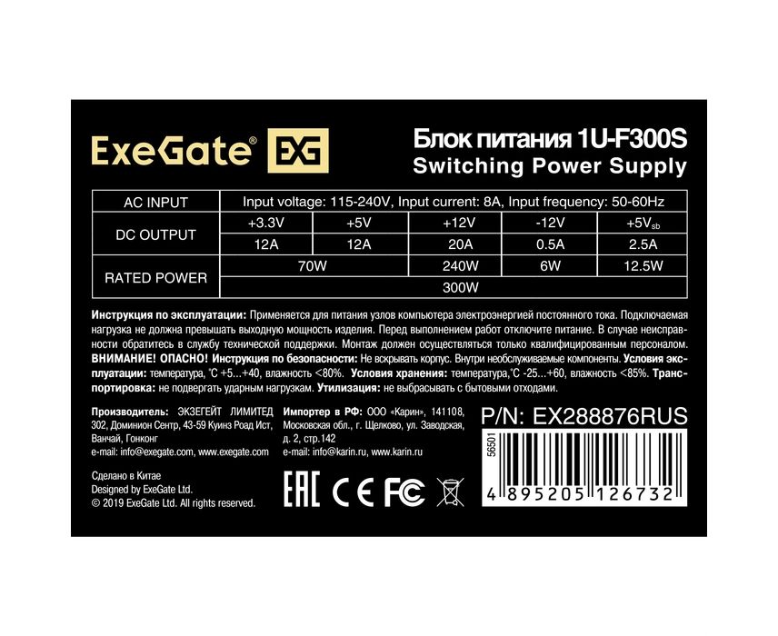 Блок питания ExeGate F300S EX288876RUS 300W (Flex ATX, for ITX case, 4cm fan, 20+4pin, 4рin, 3xSATA, 2xIDE)