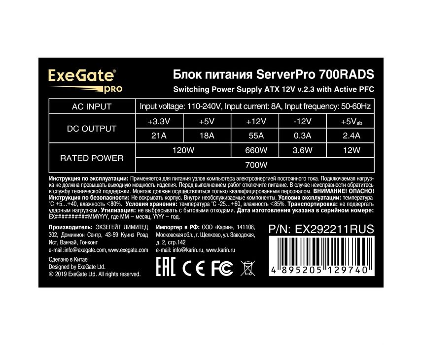 Блок питания ExeGate ServerPRO-700RADS EX292211RUS 700W (ATX, for 3U+ cases, APFC, КПД 80 (80 Plus), 14cm fan