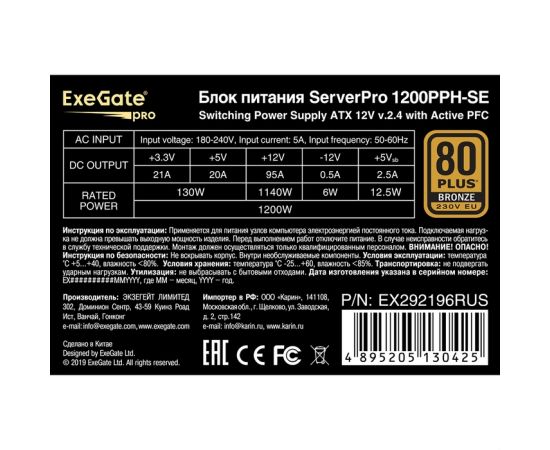 Блок питания ExeGate ServerPRO 80 PLUS® Bronze 1200PPH-SE EX292196RUS 1200W (ATX, for 3U+ cases, APFC, КПД 89% (80 PLUS Bronze), 12cm fan