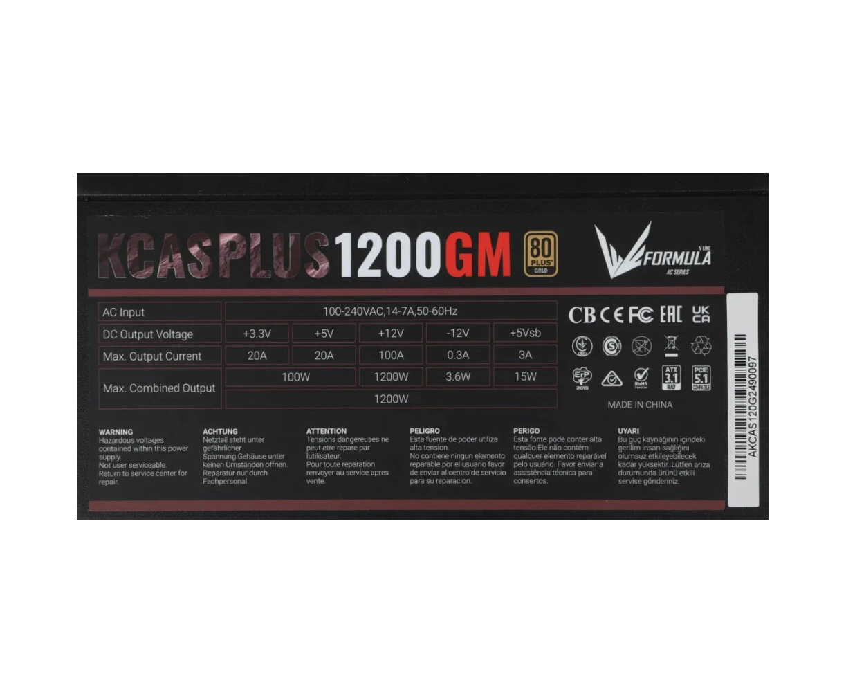 Блок питания Formula V Line KCAS Plus 1200GM, 1200W, ATX3.1/PCIe5.1, APFC, 80+ Gold, 14cm Fan, Full Modular
