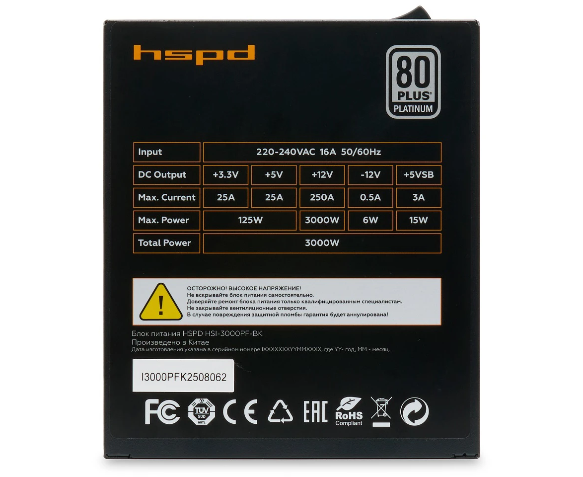 Блок питания HSPD HSI-3000PF-BK 3000W 80+ Platinum (ATX, 3.1, PCIe 5.1, Full modular, 1x24(20+4)pin 600mm, 2xCPU 8(4+4)pin 650mm)