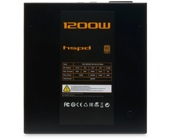 Блок питания HSPD HST-1200GF-BK 1200W 80+ Gold (ATX, 2.52, Full modular, 1x24(20+4)pin 600mm, 2xCPU 8(4+4)pin 700mm, 2xPCIe*2 8(6+2)pin