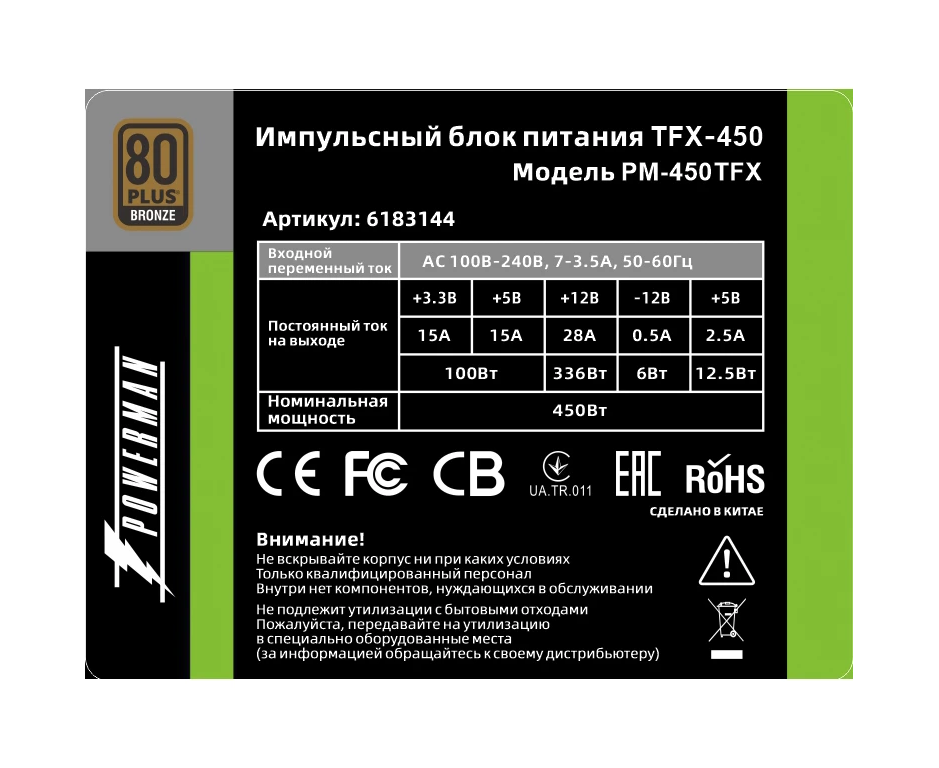 Блок питания Powerman PM-450TFX (6183144) 450W (8cm fan)