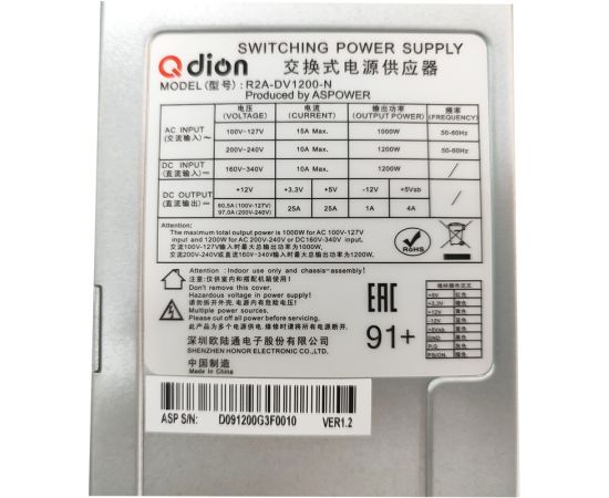 Блок питания Q-dion R2A-DV1200-N 99RADV1200I1170310 2U Redundant 1200W Efficiency 91+, Cable connector C14