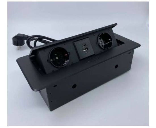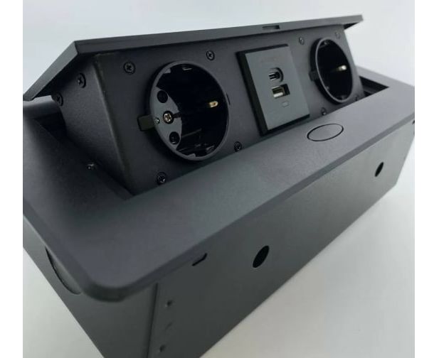 Выдвижная горизонтальная розетка, представляет собой металлический прямоугольный розеточный блок на 2 EURO, 2 USB C + A (18W).