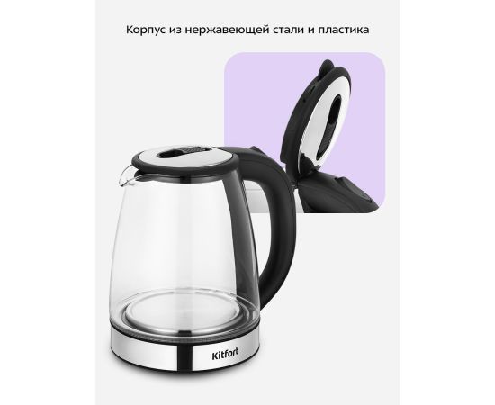 Внешняя часть корпуса выполнена из пластика и нержавеющей стали, а внутренняя − из стекла. Крышка чайника пластиковая со вставками из нержавеющей стали. Пластиковая ручка чайника не скользит и не нагревается благодаря особенностям конструкции.