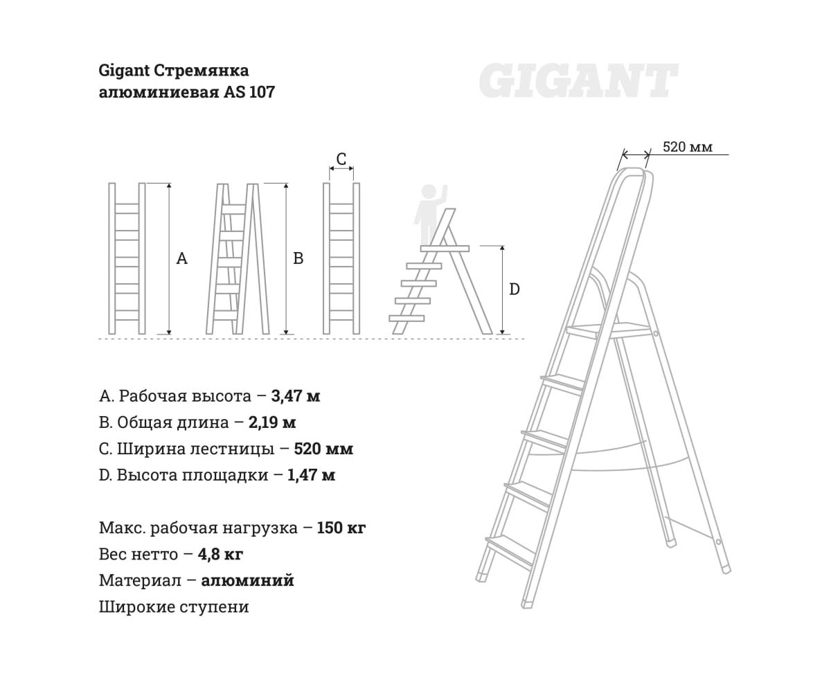Максимальная нагрузка на стремянку составляет 150 кг.