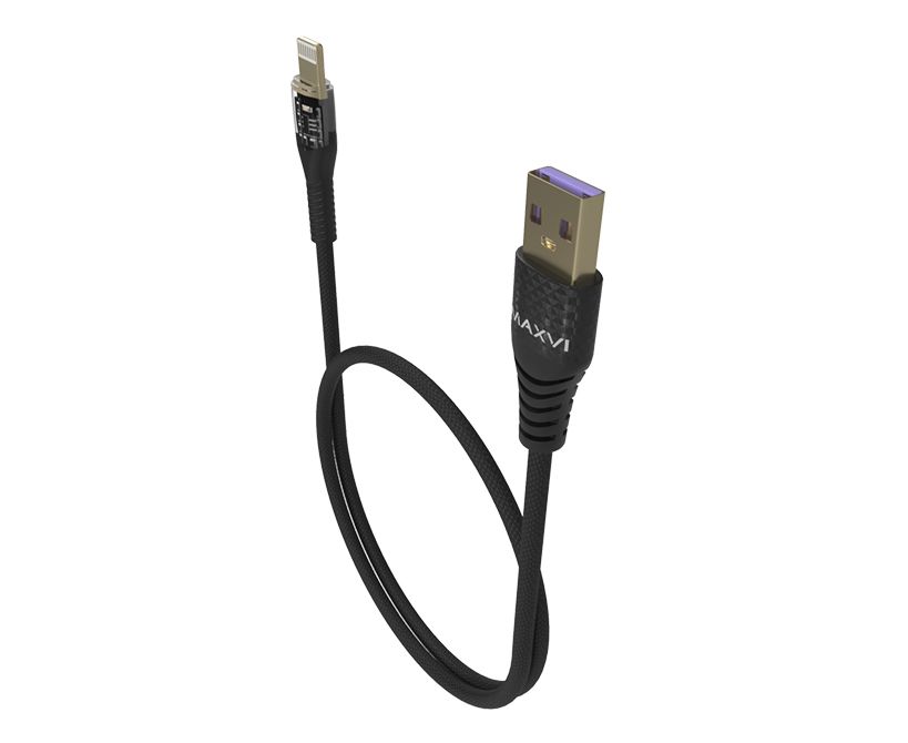 Дата-кабель Maxvi MC-31L USB-Lightning 2.4А, прозрачный корпус, LED подсветка, 1.2м, black