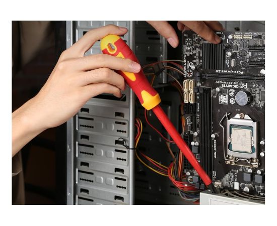 Диэлектрическая крестовая отвертка предназначена для работы с объектами, расположенными под электрическим напряжением. В первую очередь она создана, чтобы обеспечить безопасность мастера.
