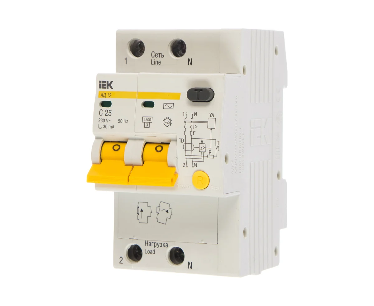Дифавтомат IEK АД12М (MAD12-2-025-C-030) 25A тип C 4.5kA 30мА A 2П 230В 3мод белый (упак.:1шт)