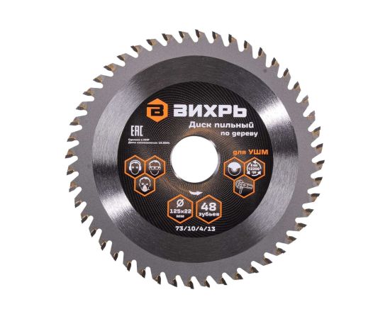 Диск пильный Вихрь 73/10/4/13 по дереву для УШМ 125х22мм, 48 зубьев+кольцо 20/22, 16/22