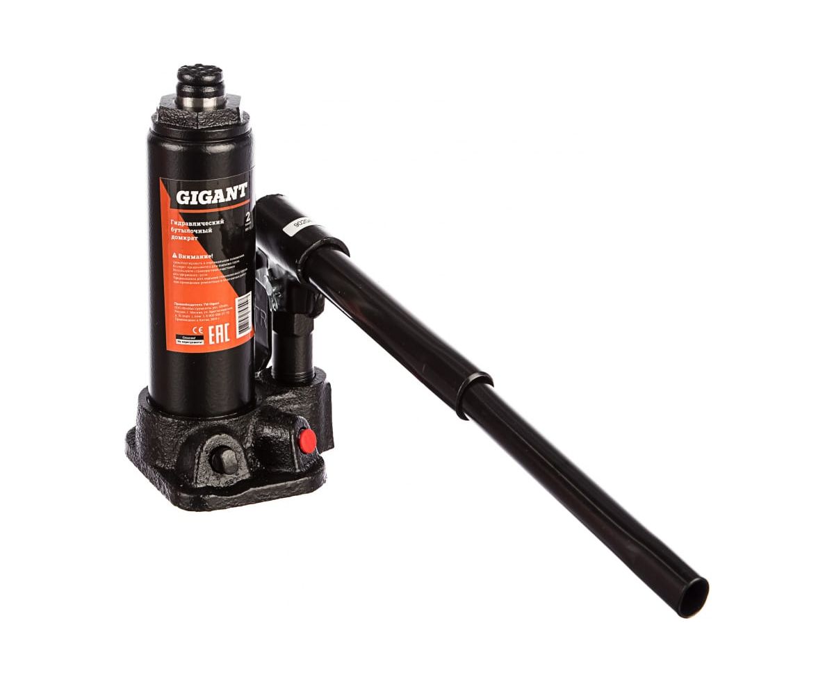 Гидравлический бутылочный домкрат Gigant 2Т HBJ-2 - качественный инструмент, который позволяет поднимать и некоторое время удерживать на высоте автомобиль. Высота подхвата данного домкрата составляет 181 мм. грузоподъемность - 2 т. Модель полностью соответствует ГОСТ Р 53822-2010. Оборудование проходит тщательный контроль качества в лаборатории завода, а также входной контроль качества перед продажей.