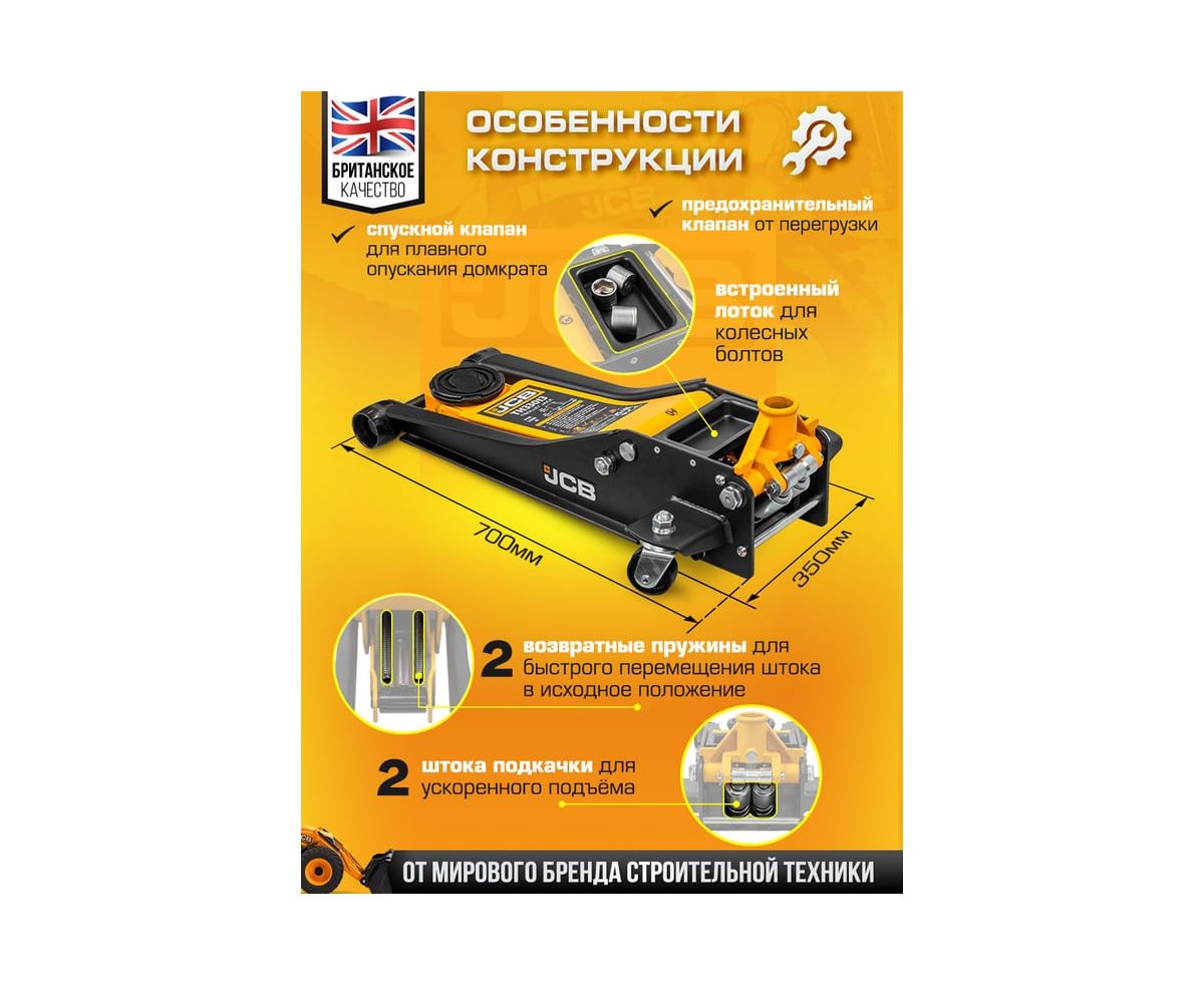 Домкрат подкатной автомобильный от бренда JCB является высококачественным оборудованием, которое предназначено для подъема автомобилей в автосервисах, шиномонтажных центрах по ремонту и техническому обслуживанию или в гараже. Устойчивый стальной корпус обеспечивает прочность и износостойкость. Подходит для автомобилей с низким клиренсом.