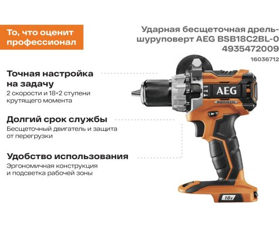 Дрель-шуруповерт AEG BSB18C2BL-0 бесщеточная ударная без акк (4935472009)