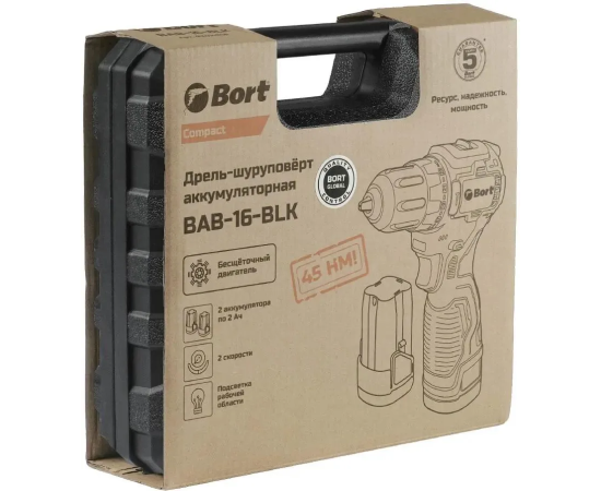 Дрель-шуруповерт аккумуляторная Bort BAB-16-BLK (93414868) с АКБ и ЗУ