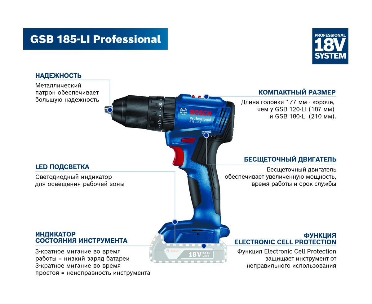 Технические характеристики Bosch GSB 185-LI (соло) 06019K3103