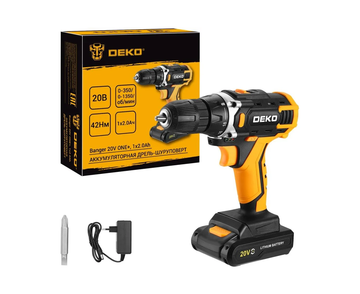 Аккумуляторная дрель-шуруповерт DEKO Banger 20V ONE+, 1x2.0Ah предназначена для строительных, слесарно-монтажных работ. Инструмент помогает быстро высверливать отверстия нужного диаметра как на деревянной, так и металлической поверхности, быстро вкручивать или извлекать крепеж.