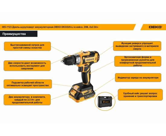 Дрель-шуруповерт DEKO DKCD20-Li (085-1123) в кейсе, 20В, 2x2.5Ач +ЗУ