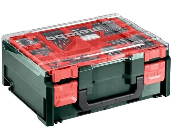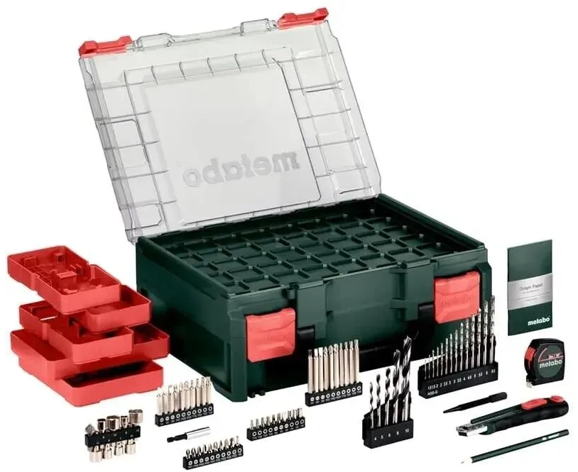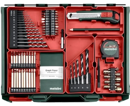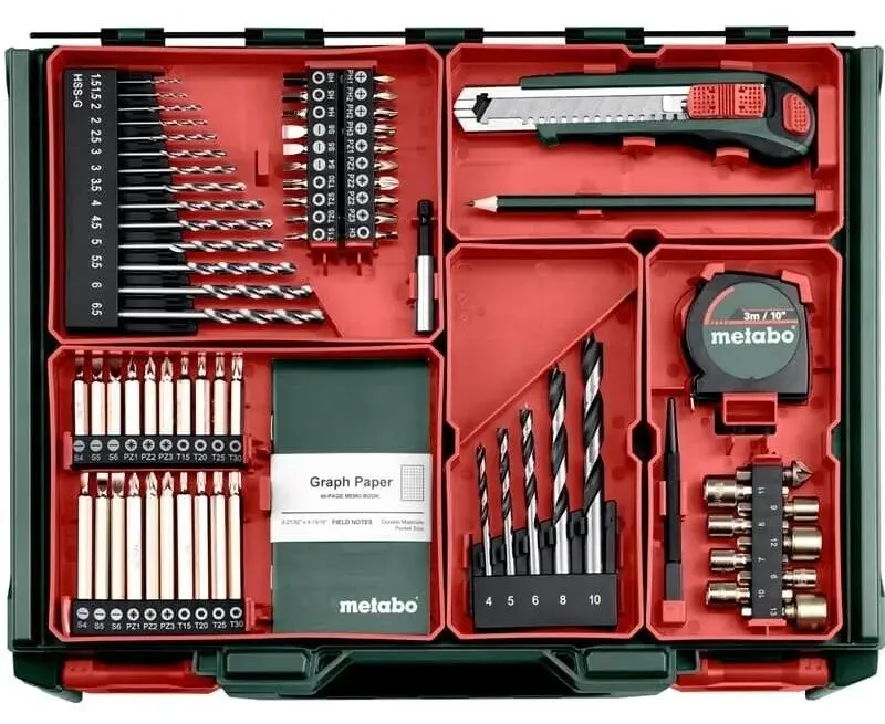 доп.: набор аксессуаров для мобильной мастерской (74 предмета) держатель бит 60 мм., 8 торцевых ключей (6/7/8/9/10/11/12/13 мм.), зенковка из дерева 12,7 мм.; центрирующий штифт (5x100 мм.); универсальный нож с 2 сменными лезвиями; измерительная лента (3 м./10 дюймов); карандаш; блокнот; кейс.