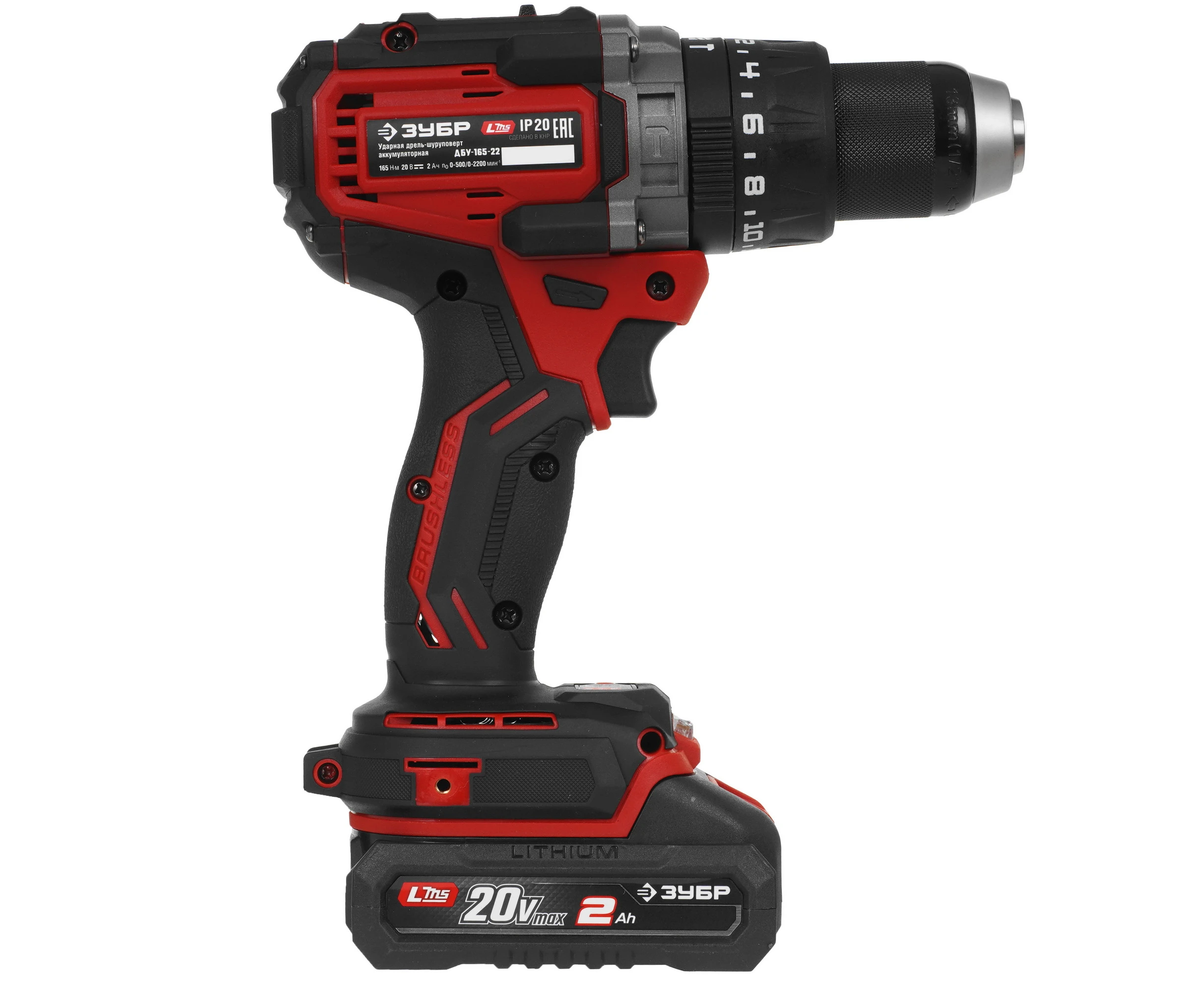 ЗУБР 20 В, 165 Н·м, 2 АКБ LMS (2 А·ч), бесщеточная ударная дрель-шуруповерт, сумка ДБУ-165-22 - бесщеточная ударная дрель-шуруповерт ЗУБР системы LMS с увеличенным крутящим моментом предназначена для быстрого заворачивания саморезов до 12 мм диаметром и сверления отверстий до 40 мм в дереве. Длительная работа от одного заряда обеспечивается эффективным двигателем BRUSHLESS. Расширенная функциональность за счет ударного режима работы. Комплектация с двумя аккумуляторами позволяет работать практически без остановки.