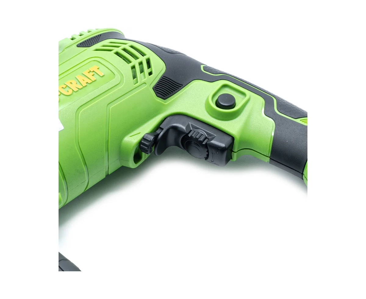 Прибор предназначен для просверливания отверстий в металлических, деревянных, бетонных элементах, изделиях из других материалов. Модель выгодно характеризуют небольшие размеры, предусмотренный конструкцией ударный режим сверления, электронный регулятор оборотов.