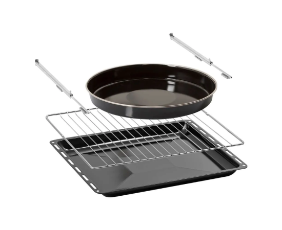 Особенности духовки, плиты: Быстрый нагрев, Вентилятор охлаждения, Встроенные часы, Дисплей, Полностью стеклянная внутренняя дверца, Хромированные направляющие