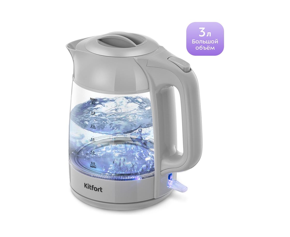 Электрический чайник Kitfort КТ-6766 предназначен для кипячения воды дома, в офисе, на даче. Ёмкость чайника 3 литра — этого хватит, чтобы приготовить горячие напитки на большую семью. Полный чайник закипает за 9 минут.