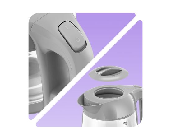 Корпус чайника выполнен из стекла и пластика. Крышка чайника полностью съёмная. Мерная шкала находится на лицевой стороне копуса. Ручка чайника пластиковая, она не нагревается и удобно лежит в руке. Переключатель расположен на ручке.