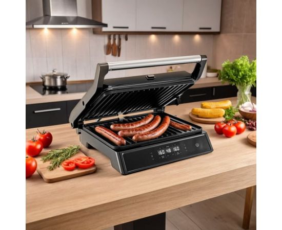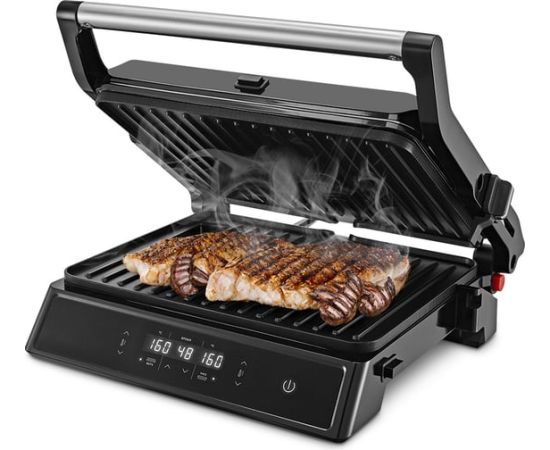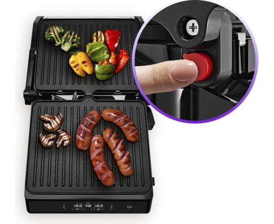 Конструкция гриля позволяет готовить в трех режимах: двустороннем, одностороннем и с приоткрытой крышкой. В двустороннем режиме гриль закрывается крышкой, благодаря чему продукты находятся между двух нагреваемых панелей и готовятся с двух сторон. В режиме приготовления с приоткрытой крышкой верхняя нагреваемая панель опускается не до конца, что полезно при готовке продуктов, которые могут потерять форму из-за давления крышки. В одностороннем режиме крышка гриля откидывается на 180°, благодаря чему гриль превращается в большую жаровню, а продукты можно выложить сразу на две панели. Данная модель оснащена поддоном для слива жира и сока, которые выделяются в процессе приготовления продуктов.