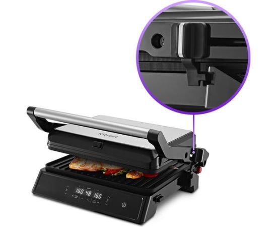 Специальный фиксатор сбоку гриля удерживает крышку в закрытом состоянии, что делает готовку, транспортировку и хранение более удобными.