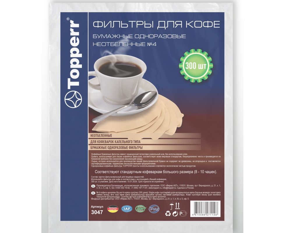 Фильтр для кофеварок TOPPERR №4 3047, бумажный, неотбеленный, 300 штук