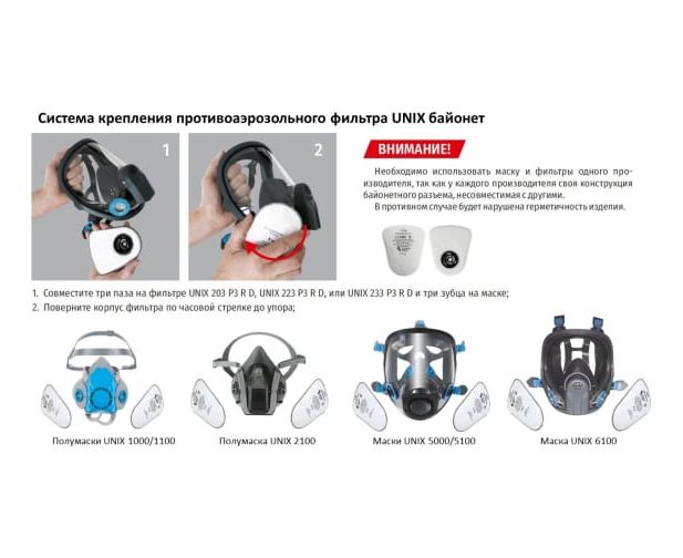 Используется в составе респираторов вместе с полумасками UNIX 1000, 1100, 2100 и в составе противогазов с масками UNIX 5000, 5100, 6100.