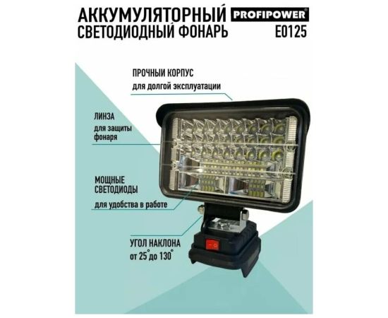 Фонарик MKDEB-18V 48Вт – электроинструмент, который необходим для освещения рабочей зоны внутри помещения или на улице. Также может использоваться в качестве аварийного освещения для подготовки к чрезвычайным ситуациям. Идеально подойдет для мастеров, которые работают в темное время суток на объекте, возле дома, или для мужчин, которые занимаются хозяйственными работами на даче или в саду. Уличный фонарь имеет небольшой вес и удобно лежит в руке. Многогранный рефлектор контролирует направление и яркость света для того чтобы обеспечить четкое круглое пятно света с равномерной высокой яркостью. Голова поворотного механизма (от -25° до +130°) позволяют максимально точно направить свет и значительно повышают удобство эксплуатации. Имеет прочный корпус и 2 USB-порта (5В/1А) для питания внешних устройств. Работает от аккумуляторов с напряжением 18 В. Максимальное время работы составляет 4 часа. Дальность освещения - 15 м. Устройство совместимо с аккумуляторами MAKITA, PROFIPOWER. Переносной диодный фонарь будет отличным подарком любимому мужу или папе на день рождения. Подумайте о приятном презенте для парня, если он любит работать и проводить время на дачном участке. Тот, кто занимается строительством или ремонтом обязательно оценят такой аккумуляторный инструмент. Фонарь светодиодный аккумуляторный ProfiPower MKDEB-18V (без аккумулятора, подходит артикул X0005, X0004 и для литиевой батареи Makita18v