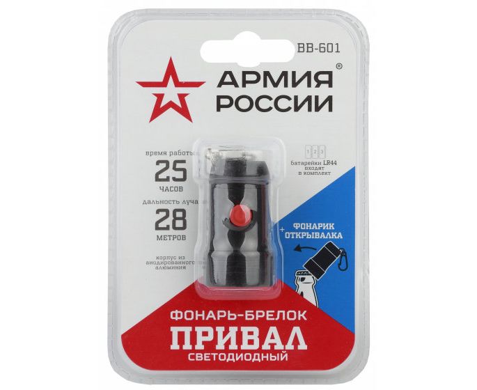 ЭРА Армия России Привал - компактный светодиодный фонарь-брелок со встроенной открывалкой. Световой луч отличной дальности - 28 метров. Качественный направленный свет за счт использования сверхъярких современных светодиодов. Батарейки в комплекте.