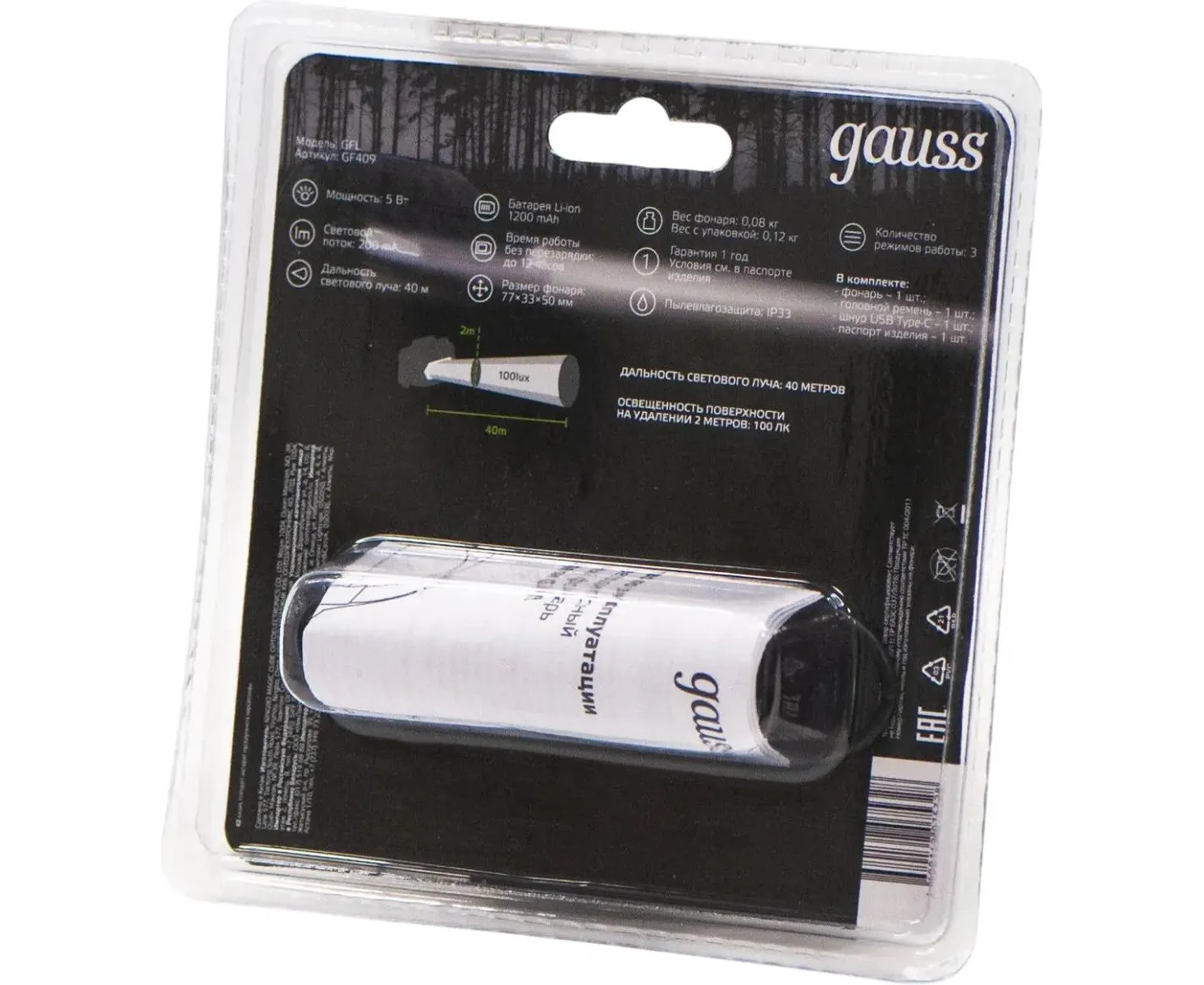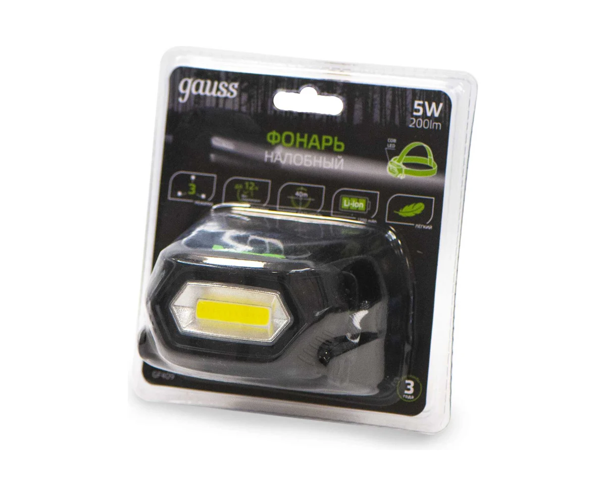 Фонарь налобный Gauss GFL409 черный 5Вт лам.:светодиод. 100lx встроенный аккумулятор (GF409)