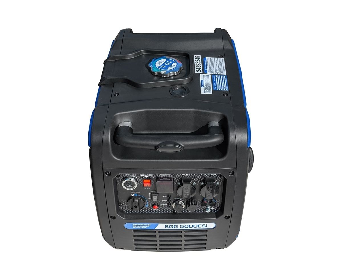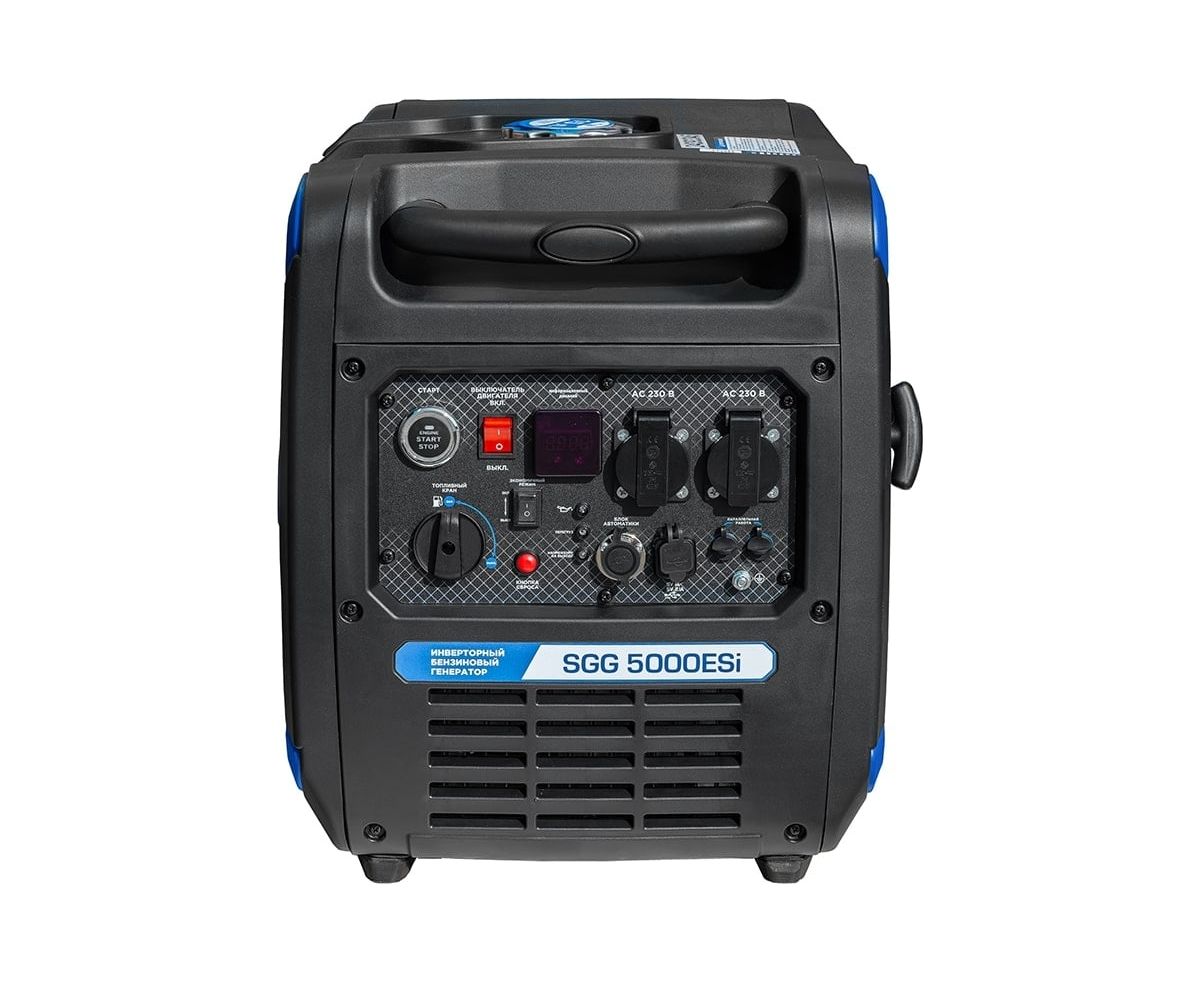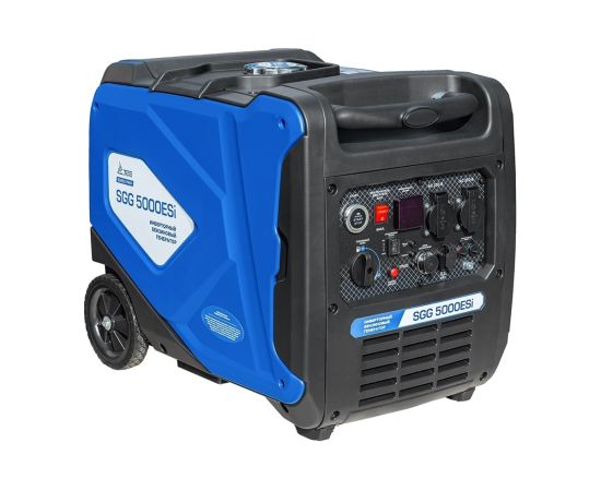 Бензогенератор инверторный SGG 5000ESi в шумопоглощающем кожухе, с электростартом и разъемом для подключения блока автоматики, вырабатывает электричество высокой точности частоты и напряжения.
