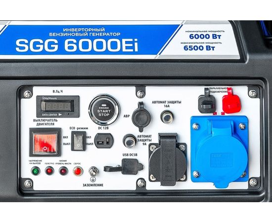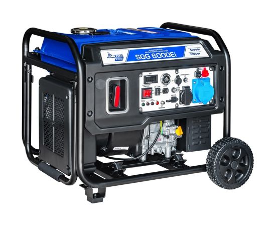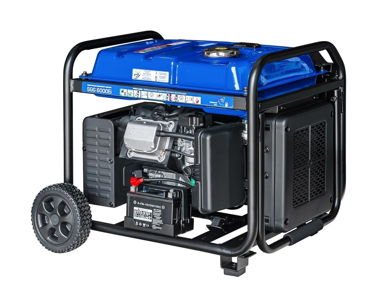 Бензогенератор инверторный SGG 6000Ei с электростартом, коннектором для подключения АВР, укомплектован колёсным комплектом для удобства перемещения.