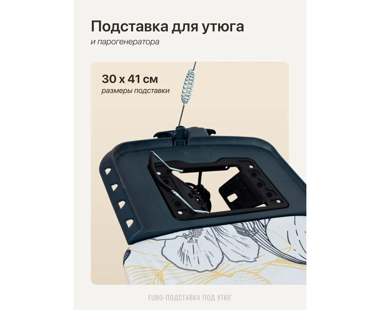 Широкая гладильная доска предназначена для глажки белья. Модель оснащена электросоединителем и эргономичной подставкой под утюг.