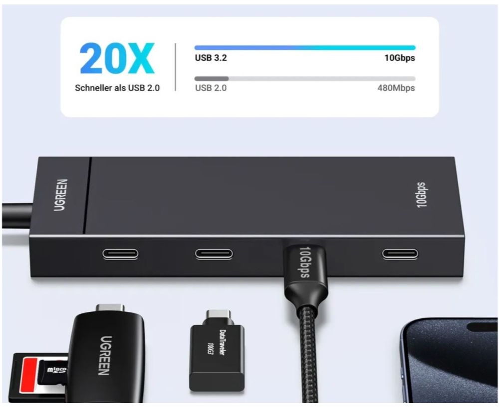 Этот компактный и удобный USB-хаб расширяет возможности подключения через USB-C. Он превращает один порт USB-C на устройстве в четыре, обеспечивая быструю передачу данных со скоростью до 10 Гбит/с. Например, файл объемом 20 ГБ можно передать всего за 16,4 секунды. Обратите внимание, что порты предназначены только для передачи данных и не поддерживают зарядку и вывод видео.